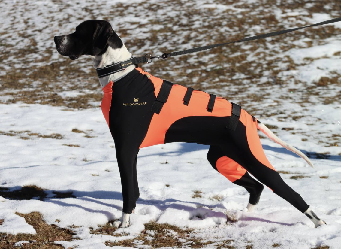 Justerbar passform: Fyra kardborreband med justering samt dragkedja på ryggen gör att overallen kan anpassas efter hundens kropp för bästa komfort och rörelsefrihet.